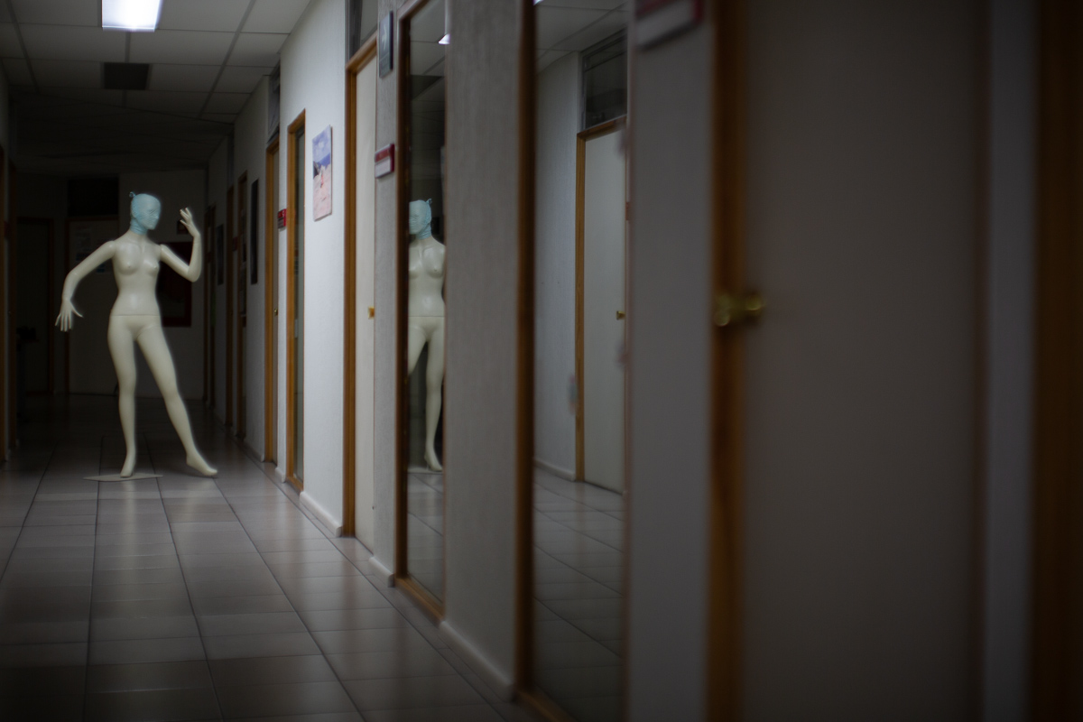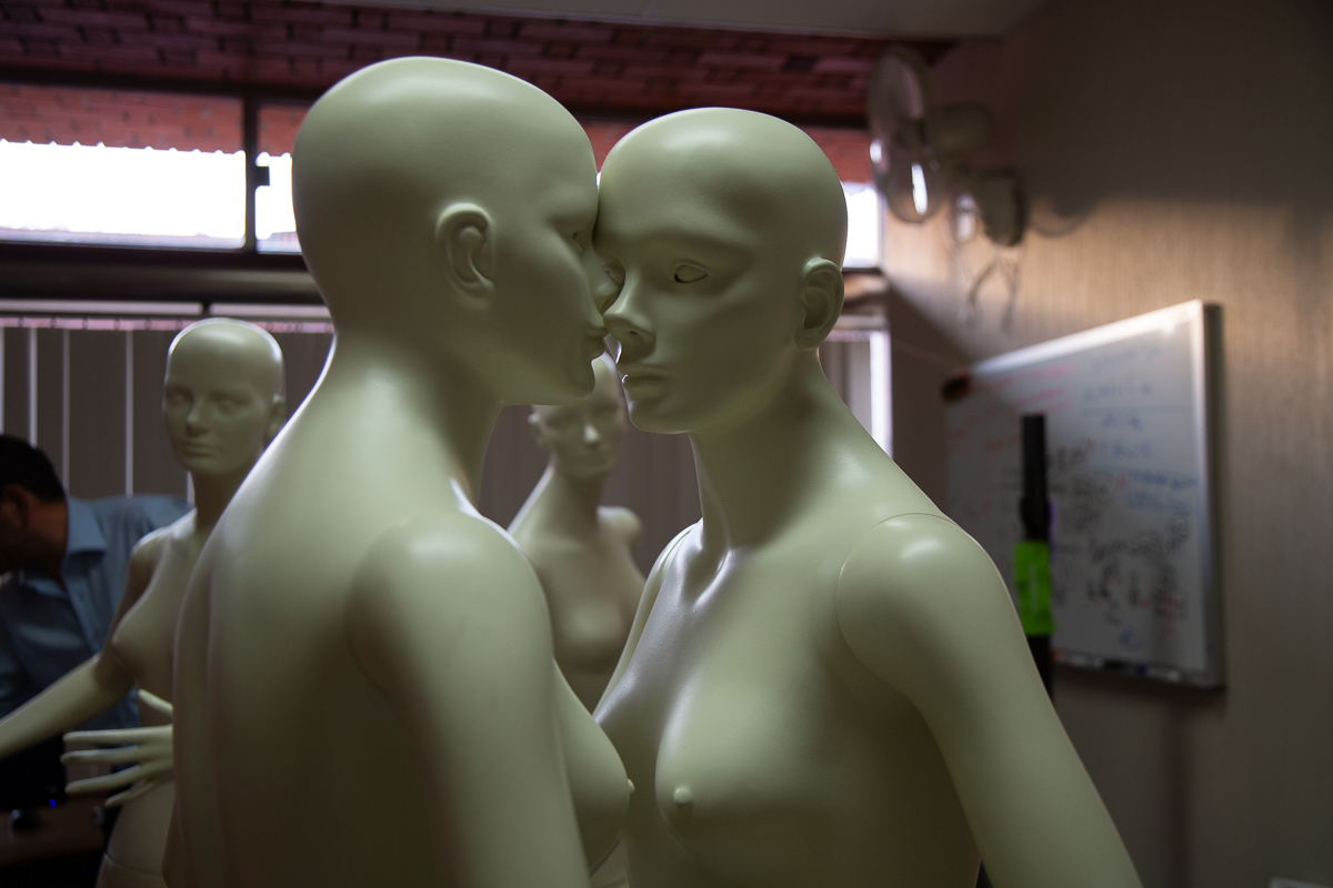 Cinco personajes de fibra de vidrio, sus cabezas textilmente intervenidas y dispuestos relacionalmente entre ellos sobre una tarima de 10 x 10 mts para interpelar y ser transitados por los visitantes. Un primer binomio, “Los Dos Renés”, parafrasean el beso imposible de Los Amantes de Magritte (1928): René Descartes y René Magritte; racionalismo y surrealismo en confrontación erótica, impedidos para consumar el beso de su intimidad. Cerca de ellos, “Eva Verde” sostiene, tensa, la magritteana manzana. Con ojos vendados pero boca liberada, extiende la mano para dilatar la mordida del deseo. “Narcisa” es la cuarta figura: lencería de encaje fino ahoga su rostro y le impide admirar el reflejo de su propia belleza. A lo lejos, la mesiánica figura “Come to me Bro”, extiende implorante las manos hacia el conjunto de figuras veladas, cada una absorta en su propia imposibilidad de encuentro.