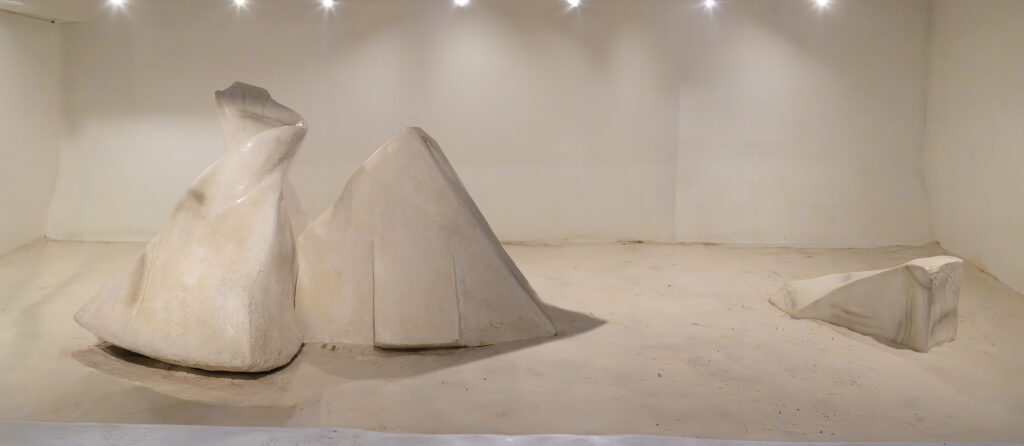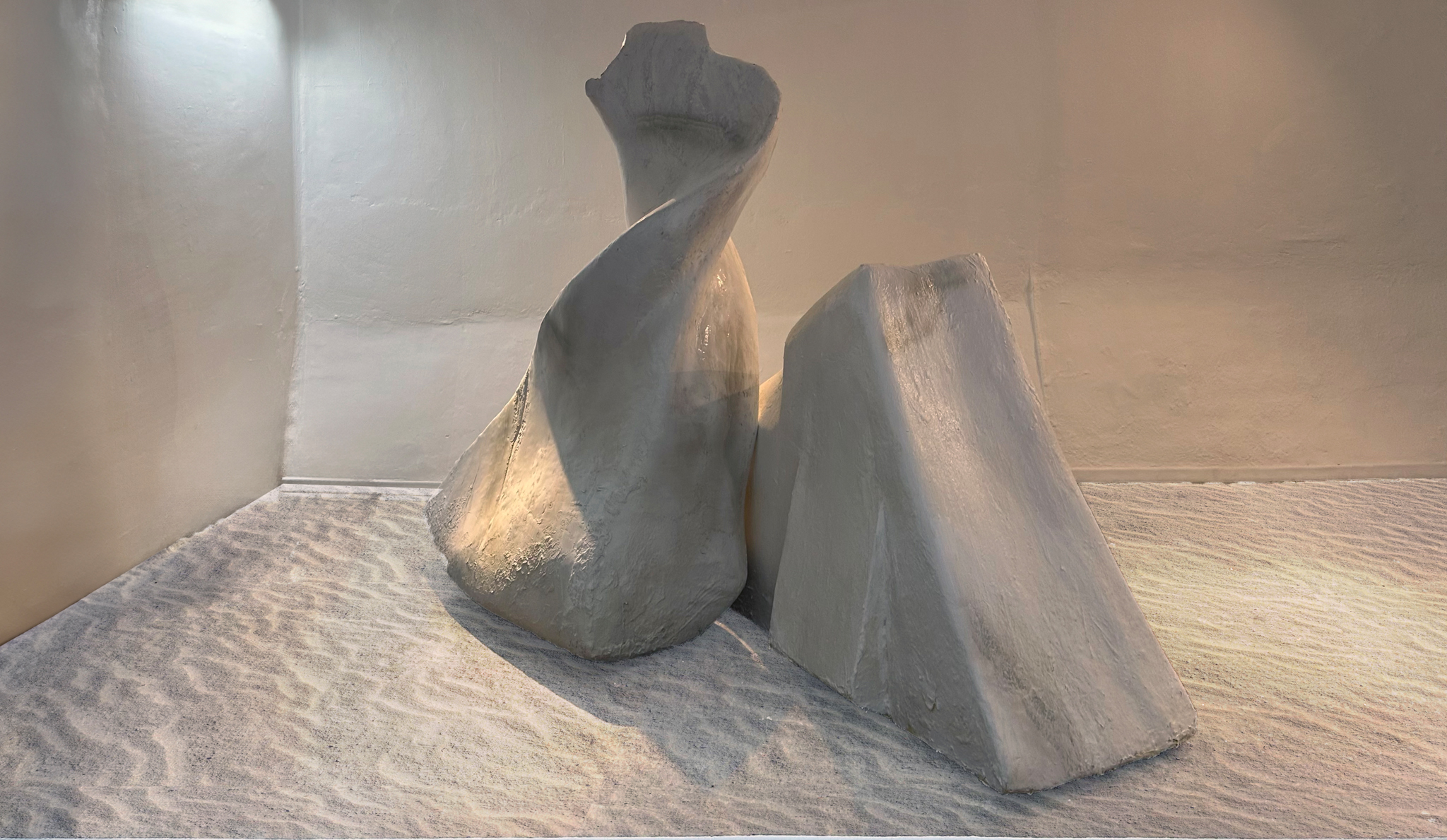 Dos figuras en contacto ambiguo: la primera de base indefinida y naturaleza inestable, se tambalea a la vez que mantiene su integridad como llama volátil. La segunda, de apariencia firme, proyecta contundencia a la vez que revela su incomplitud, marcada por su uso como fuente de extracción de carga. La ambigüedad intrigante sobre cuál de las dos sirve de sostén a la otra.